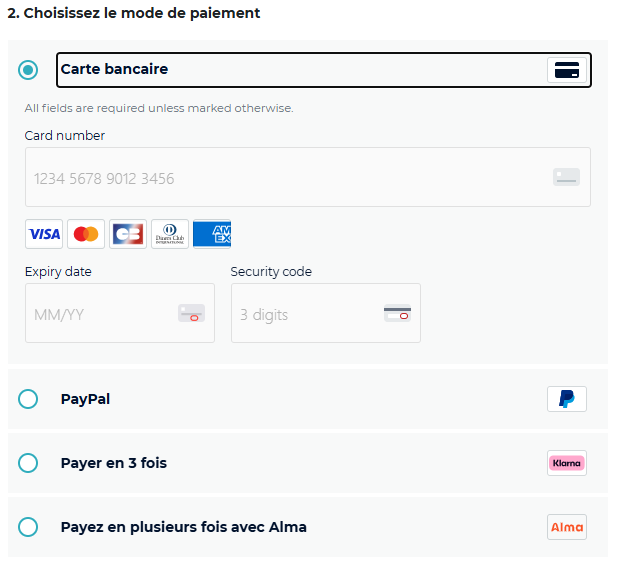 - Klarna : Acheter maintenant, payez plus tard ! Au moment du règlement, le montant total de l'achat peut être divisé en plusieurs paiements liés au compte Klarna. Aucun coût supplémentaire.
