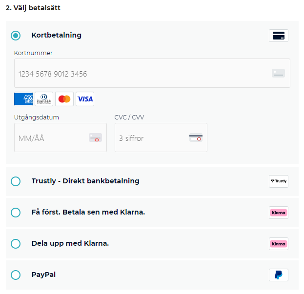 - Klarna: "Få först. Betala sen" eller "Delbetalning". För att se villkoren och läsa om hur det fungerar, besök Klarnas hemsida